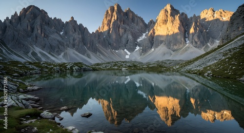 Obraz premium Serene mountain range reflected in a calm, clear lake, lit by warm morning sunlight