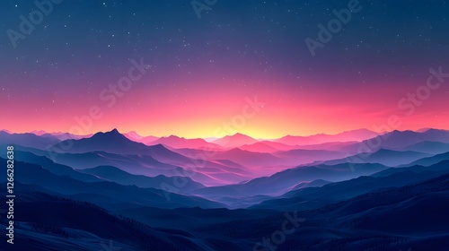 © comando, Fototapeta premium Serene mountain range view with a vibrant gradient sunset sky landscape