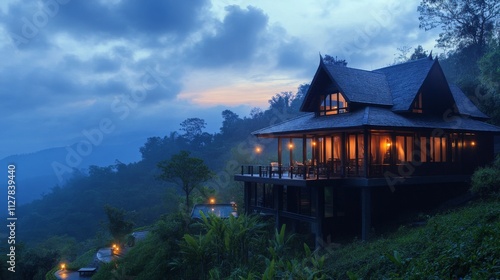 © Phunnada, Fototapeta premium Serene Mountain Retreat at Twilight