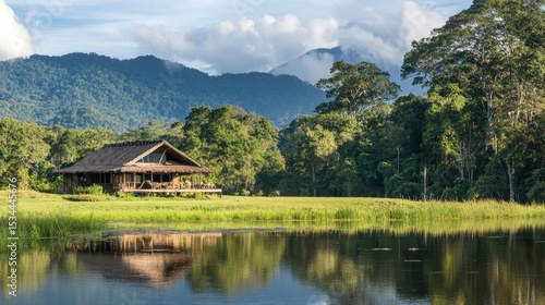 Fototapeta premium Serene Mountain Retreat with Rustic Lodge Amidst Lush Greenery and Reflective Water in Vibrant Nature Setting