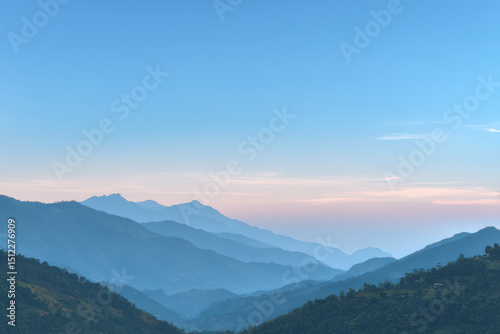 © Oleksandr, Obraz premium serene mountain ridge in bhutan during soft twilight captured from topdown perspective