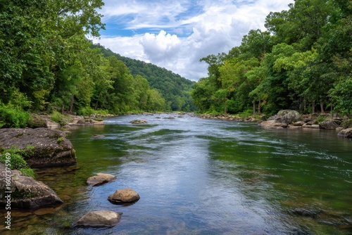 © Eibrahim Imagery, Fototapeta premium Serene mountain river flowing through lush green forest under a cloudy sky