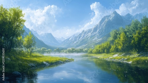© Fenny, Fototapeta premium Serene mountain river valley, misty dawn, scenic landscape, travel poster
