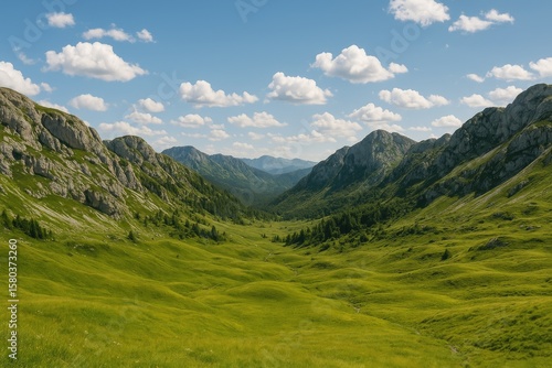 © The 2R Artificiality, Obraz premium Serene mountain scenery featuring gentle rocky peaks and lush green valleys