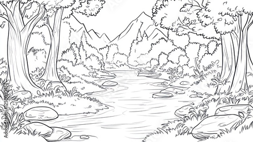 Naklejka premium Serene mountain stream flows through lush forest; nature scene, coloring book...