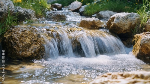 © Pichapob, Obraz premium Serene Mountain Stream with Clear Fresh Drinking Water Flowing