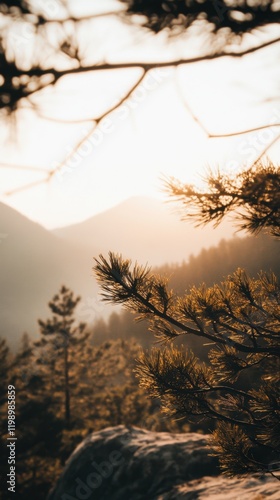 © ElenaX, Obraz premium Serene mountain sunrise pine trees