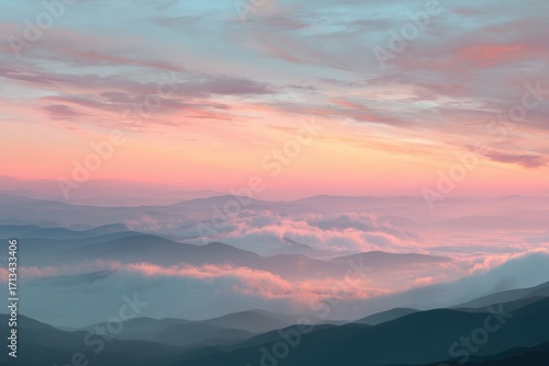 Fototapeta premium Serene mountain sunrise with pastel skies and misty peaks, dreamy landscape...