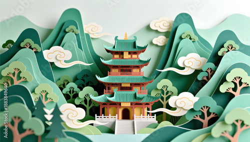 © lin, Fototapeta premium Serene mountain temple hidden among swirling auspicious clouds