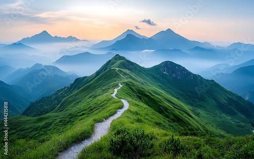 Fototapeta premium Serene mountain trail at sunrise. Lush green hills, winding path through peaks