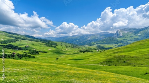 © Solikah, Fototapeta premium Serene Mountain Valley Landscape under a Summer Sky