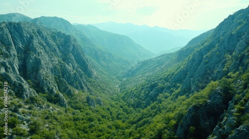Naklejka premium Serene Mountain Valley Landscape Under Soft Light