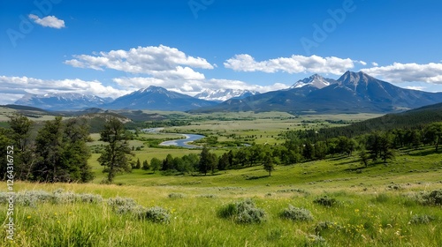 © artzone, Fototapeta premium Serene Mountain Valley Landscape with Lush Green Meadows under a Blue Sky