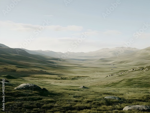 Naklejka premium Serene mountain valley landscape with rolling hills, grass, and rocks under a...
