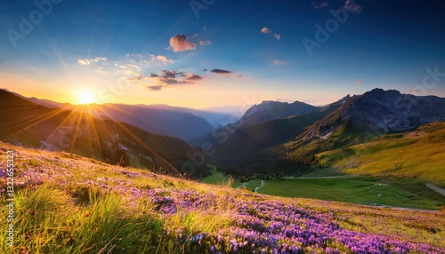 © netsay, Fototapeta premium Serene Mountain Valley Sunset A Spectacular Alpine Panorama Bathed in Warm Glows, Capturing Tranquility and Majesty as the Day Fades into Twilight.