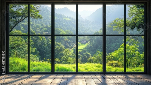 © afridwi, Naklejka premium Serene Mountain View from a Panoramic Window