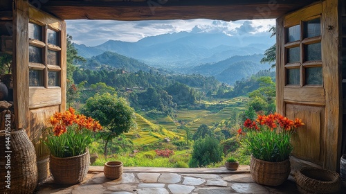 © Achmad, Fototapeta premium Serene Mountain View from Rustic Wooden Window