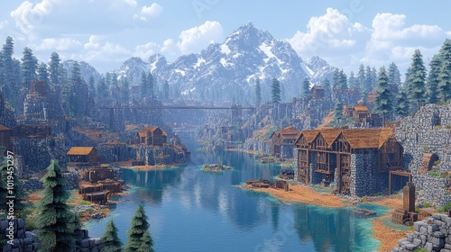Fototapeta premium Serene mountain village by a river with wooden structures.