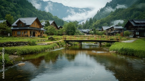 Fototapeta premium Serene Mountain Village with Traditional Houses and Calm River Surrounded by Lush Greenery and Misty Mountains