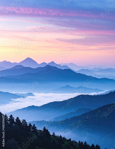 © gugur, Obraz premium Serene mountain vista at dawn, layers of blue hills fading into the horizon beneath a pink and blue sky. Lush forest lines the foreground