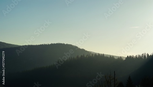 Fototapeta premium Serene mountainous landscape at dawn with misty forests and soft sunlight