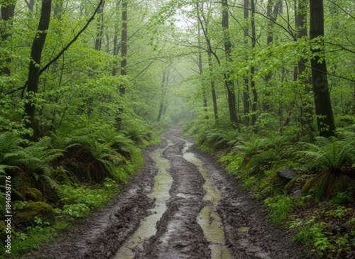 Obraz premium Serene Muddy Path Through Lush Green Forest in Foggy Atmosphere