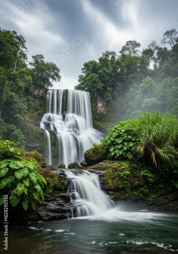 © Muhammad, Fototapeta premium Serene Multilevel Waterfall Amidst Lush Tropical Vegetation under Cloudy Skies