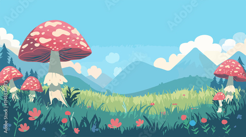 © David, Fototapeta premium Serene Mushroom Meadow Under Blue Sky