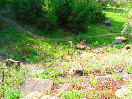 © Garry Sanders, Fototapeta premium Serene natural landscape with a winding path through lush green foliage and rocky terrain