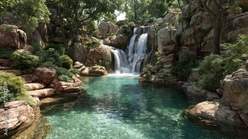 Naklejka premium Serene natural landscape with cascading waterfall flowing into clear turquoise pool surrounded by lush green trees and rocky terrain in a tranquil outdoor setting