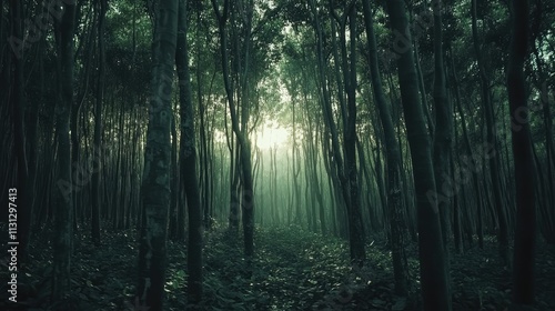 Obraz premium Serene natural rubber tree plantation shrouded in mist with sunlight filtering through dense forest canopy