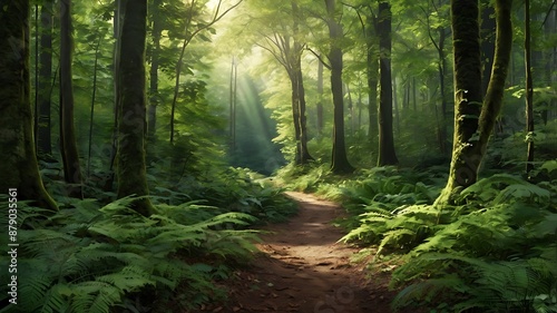© Safat's Hub, Fototapeta premium Serene Nature Forest Path with Lush Greenery and Dappled Sunlight