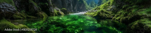 © HDR Image Creator, Fototapeta premium Serene nature hdr panorama of lush green river valley scenic landscape view