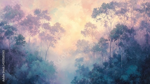 Fototapeta premium Serene Nature Landscape with Soft Mist and Lush Trees in Pastel Hues at Dawn...