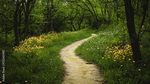 Fototapeta premium Serene Nature Path Surrounded by Vibrant Wildflowers and Greenery
