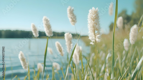Fototapeta premium Serene nature scene calm water white grasses tranquil landscape