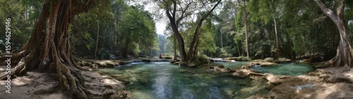 © Ayou.Y, Naklejka premium Serene nature scene 360 degrees hdr panorama in lush forested river environment