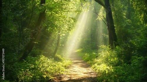 © PalaG, Fototapeta premium Serene Nature Trail in Lush Green Forest with Sunlight Filtering Through Leaves