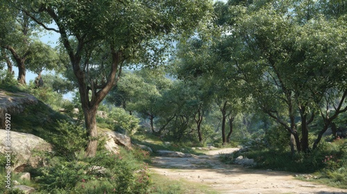 Fototapeta premium Serene Nature Trail Surrounded by Lush Green Trees and Scenic Rock Formations...