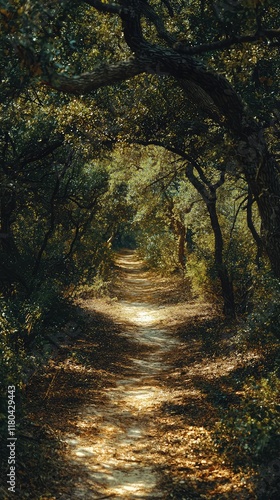 Naklejka premium Serene Nature Trail Surrounded by Lush Greenery and Sunlight