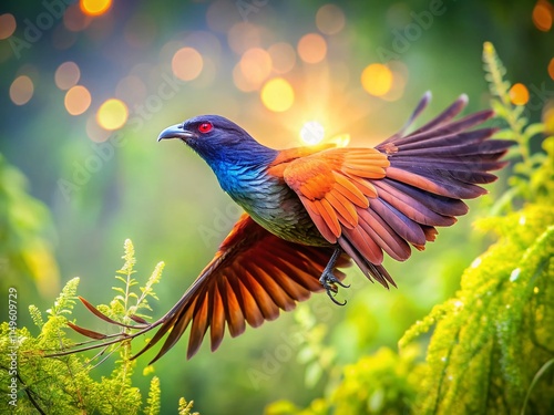 © Adisorn, Fototapeta premium Serene Nature Wallpaper: Greater Coucal Bird in Flight