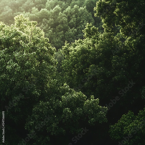 © Mukta, Obraz premium Serene nature with green trees and soft sunlight filtering