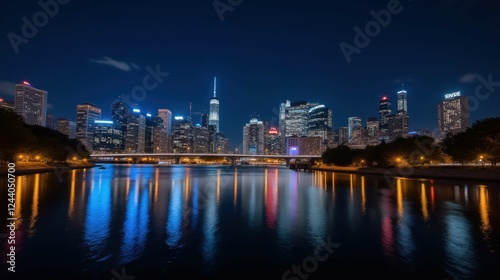 Fototapeta premium Serene Night Cityscape Reflection Over Calm Water Body in Urban Setting