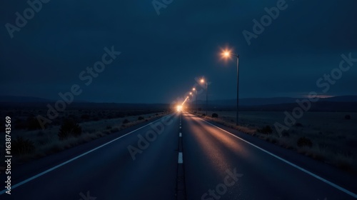 Fototapeta premium Serene Night Drive on a Long, Straight Asphalt Road with Lights Guiding the Way