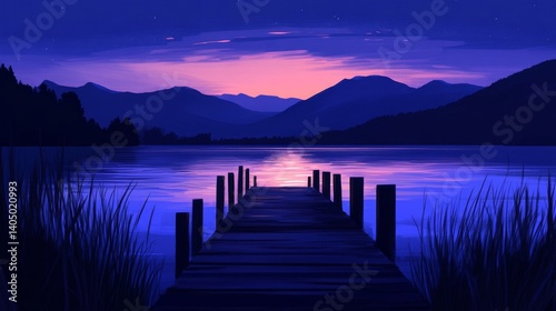 © Lintan, Fototapeta premium Serene Night Lake Sunset with Purple Sky and Silhouette Mountains