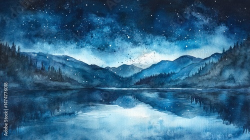 Fototapeta premium Serene night landscape reflecting mountains and starry sky over a tranquil...