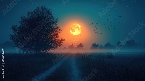 Fototapeta premium Serene Night Landscape with Full Moon and Misty Pathway Under Starry Sky
