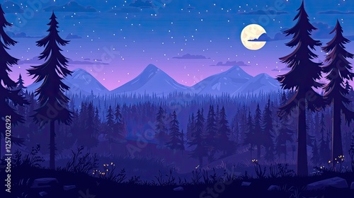 Fototapeta premium Serene night landscape with mountains, pine trees, and a full moon illuminating the sky