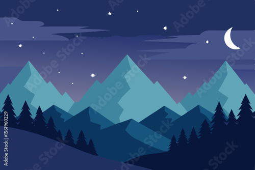 © Adi, Fototapeta premium Serene Night Majestic Mountains under a Crescent Moon