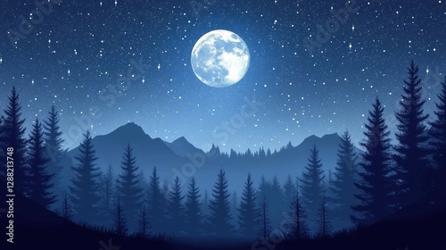© Arif, Naklejka premium Serene Night Over Forest With Mountains and a Bright Full Moon